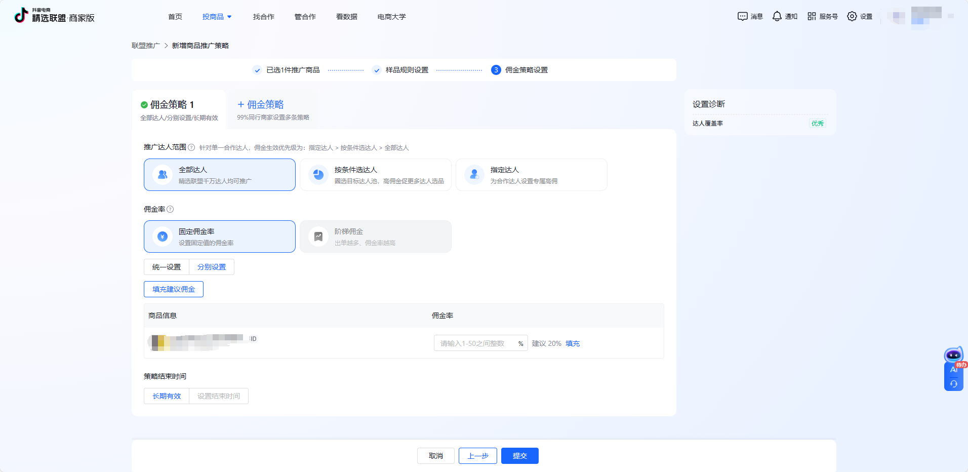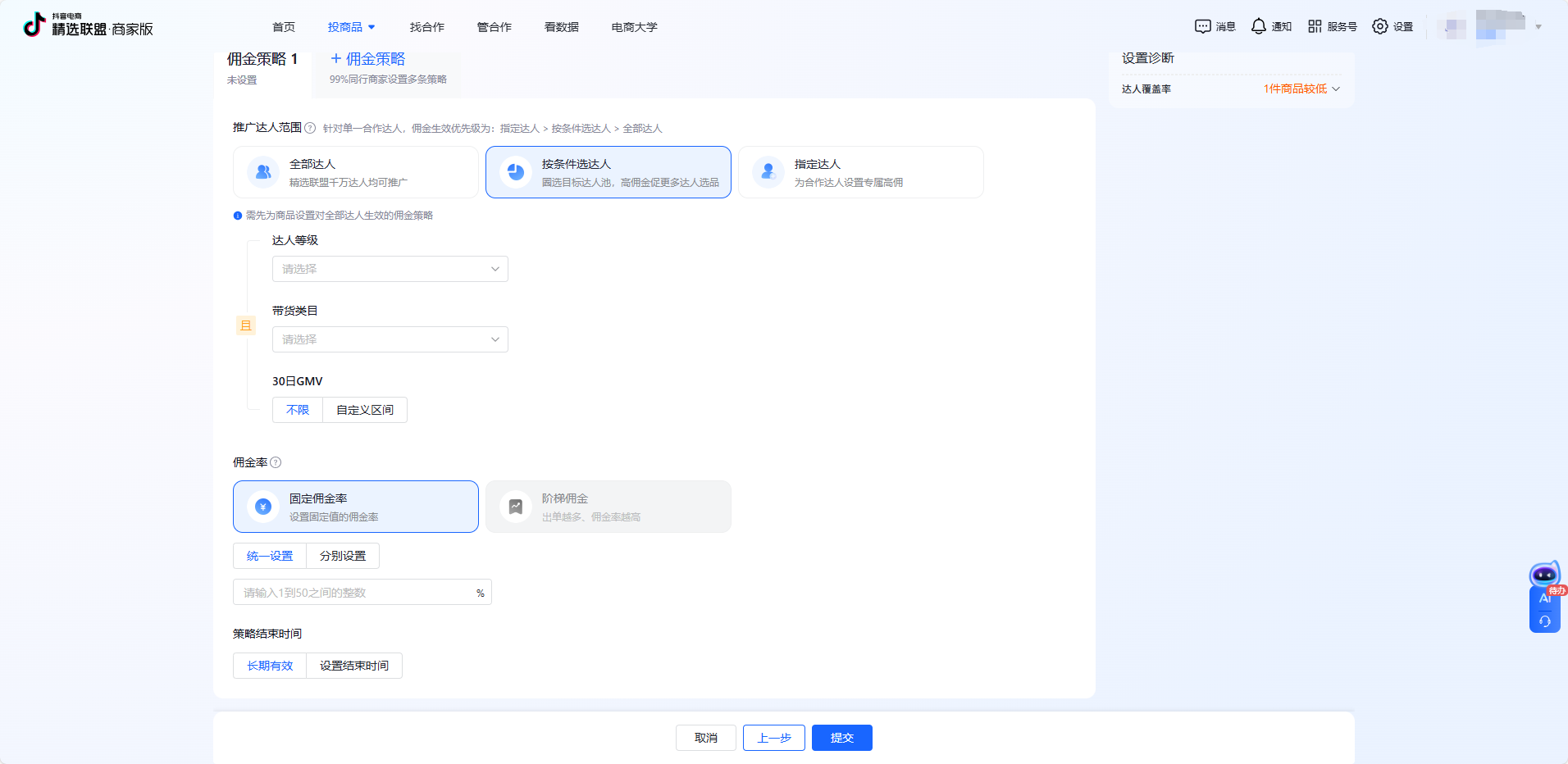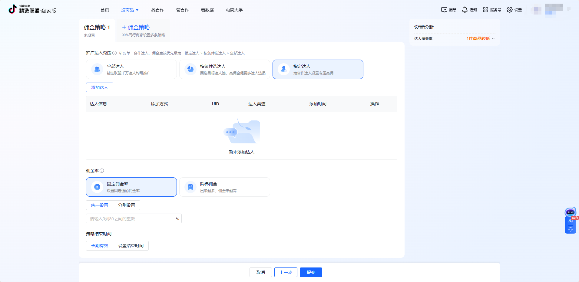 然后进入佣金策略设置,在这里可以选择三个推广达人的范围,全部达人-按条件选达人-指定达人。